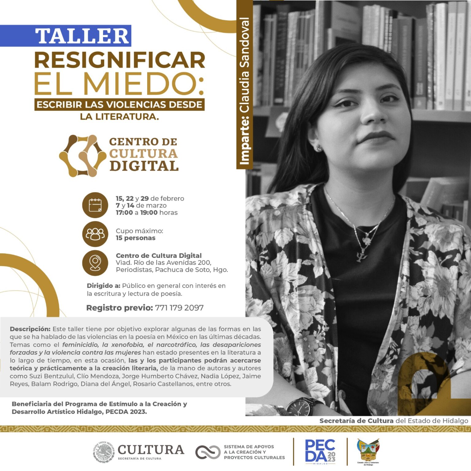 El Centro de Cultura Digital será sede del taller “Resignificar el miedo: escribir las violencias desde la literatura”, a cargo de Claudia Sandoval, beneficiaria del Programa de Estímulo a la Creación y Desarrollo Artístico Hidalgo (PECDA) 2023, por lo que invita al público en general a ser parte del proyecto que comienza sesiones este 15 de febrero.