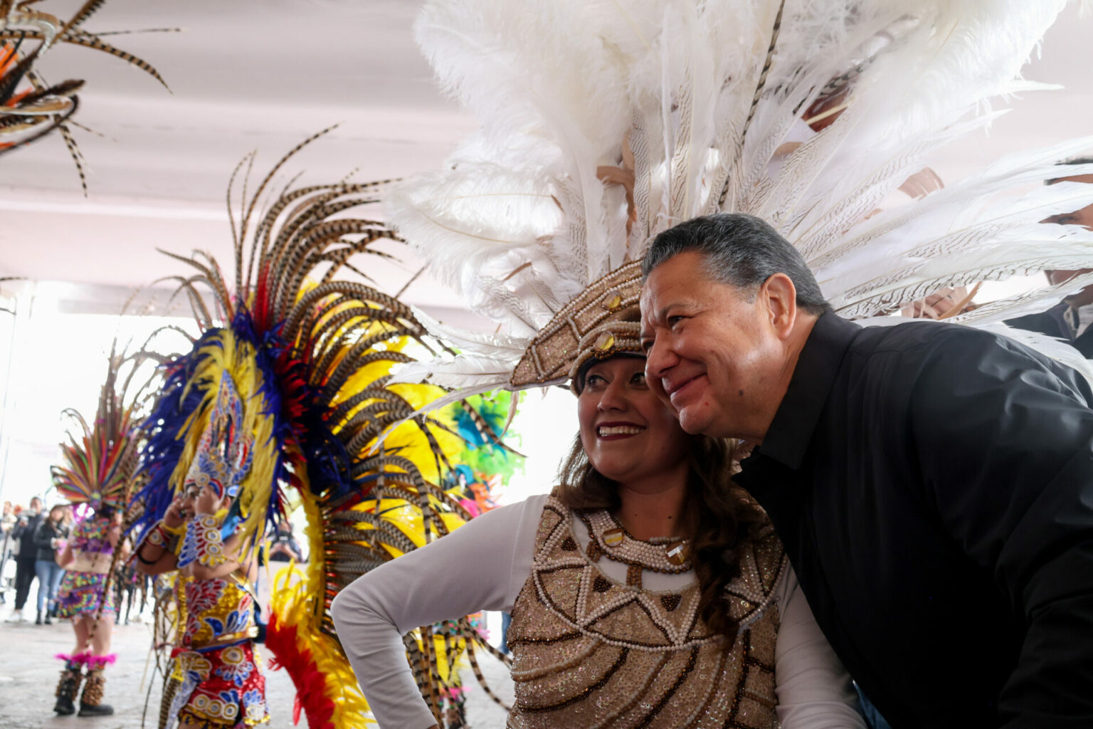 En la Plaza Juárez, la lluvia permitió una tregua, mientras la comparsa de Metepec sacudió el frío a los asistentes al ritmo de la banda, donde además se pudo apreciar el esmero y cuidado que los danzantes ponen en sus trajes, al portar enormes penachos de colores, pecheras y adornos que recuerdan las profundas creencias religiosas e indígenas de esa región.