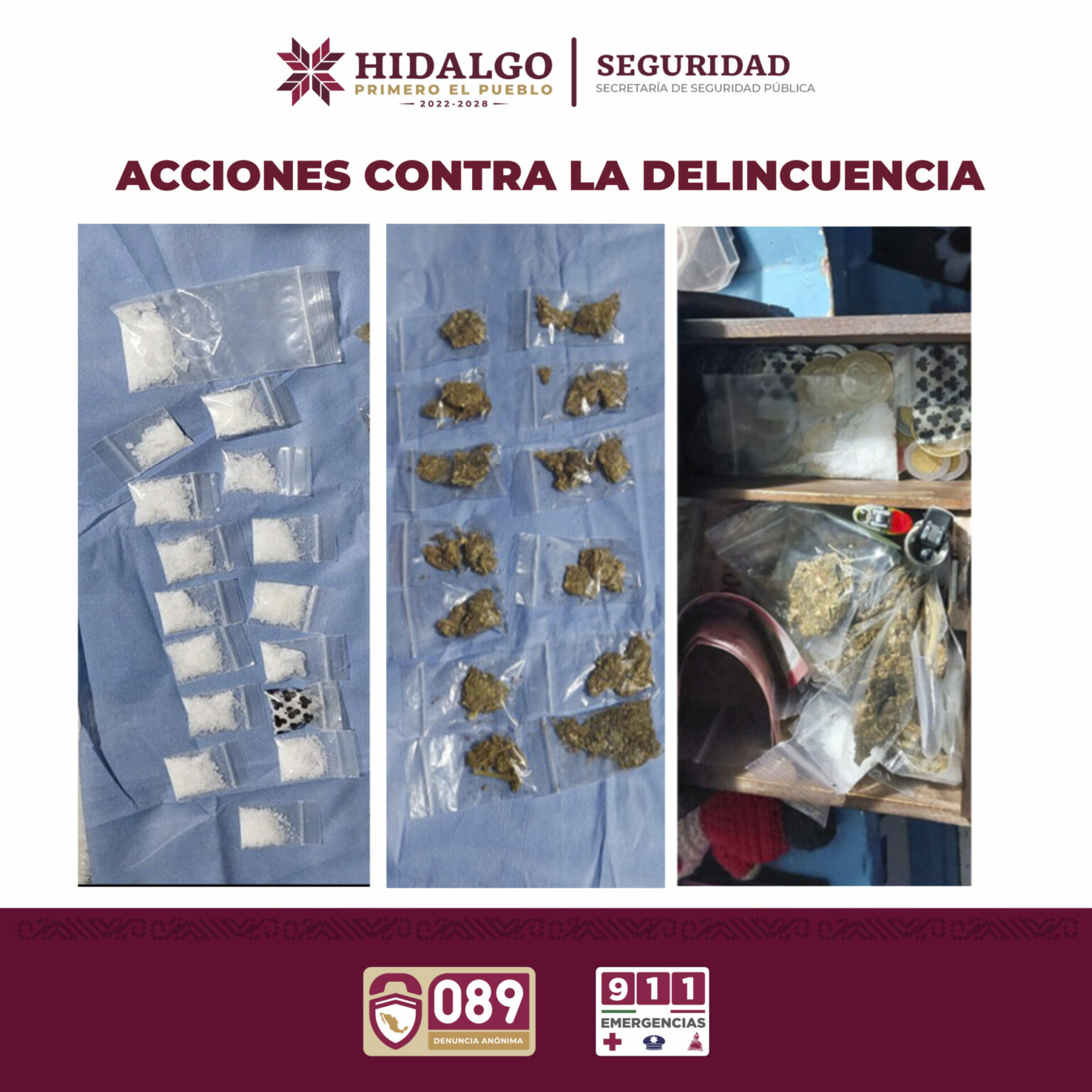 Mientras tanto, en un domicilio de la colonia Cuauhtémoc, municipio de Tlahuelilpan, se logró la aprehensión de un sujeto identificado como J. M. H., a quien le incautaron 217 dosis de presunta marihuana, así como 67 dosis de droga sintética “cristal”.