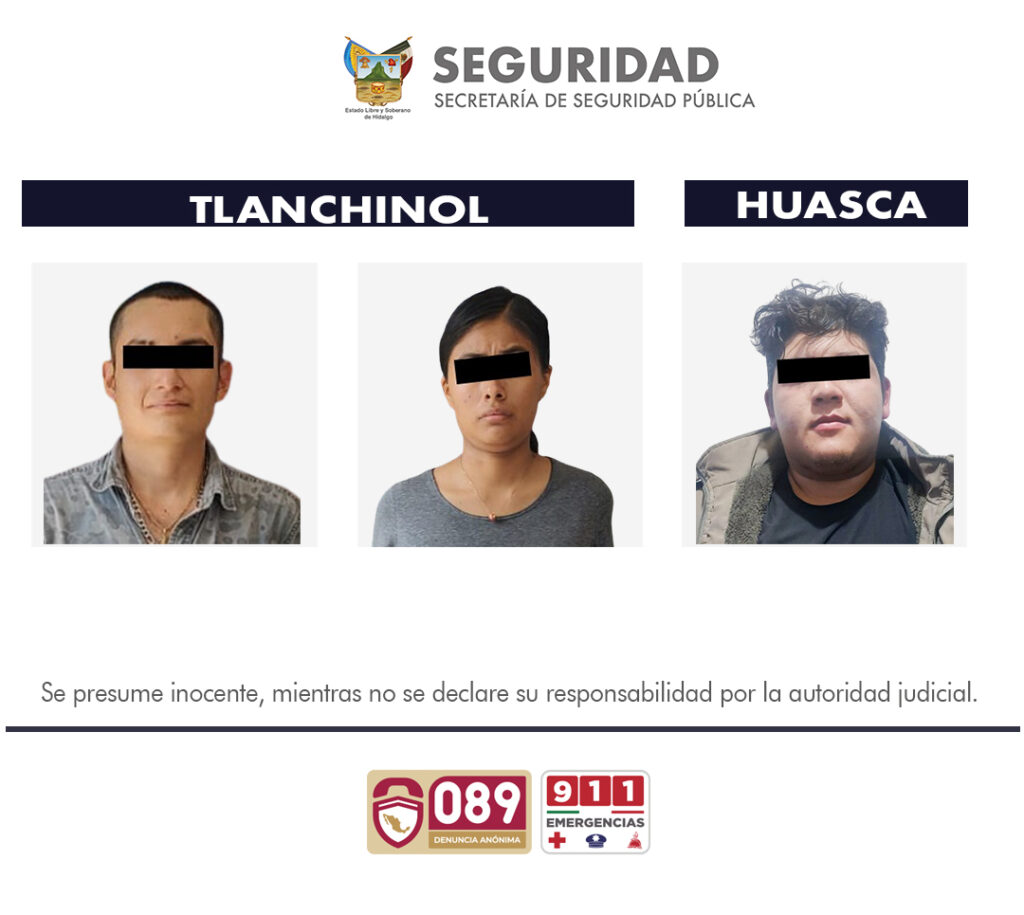 La Secretaría de Seguridad Pública de Hidalgo (SSPH) llevó a cabo la detención de tres personas por su posible relación en hechos constitutivos de delito.