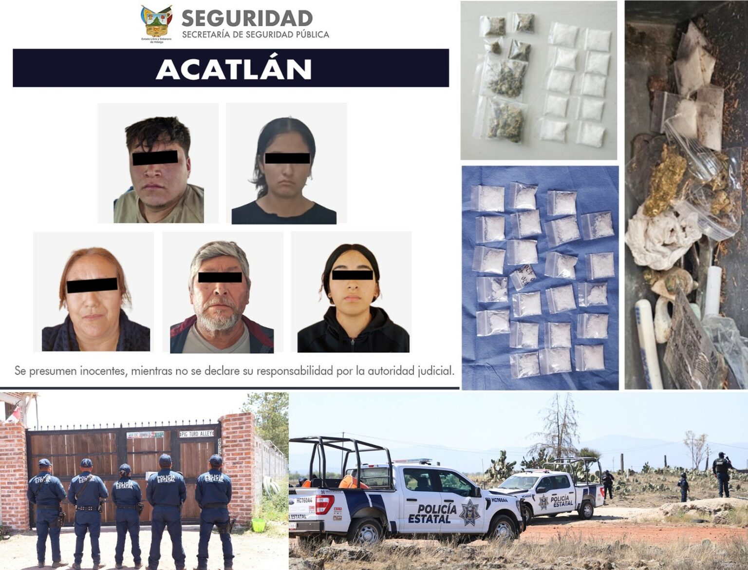 PACHUCA, Hgo.- Mediante trabajos de inteligencia operativa, la Secretaría de Seguridad Pública de Hidalgo (SSPH), llevó a cabo la detención de cinco personas durante un operativo en el municipio de Acatlán.