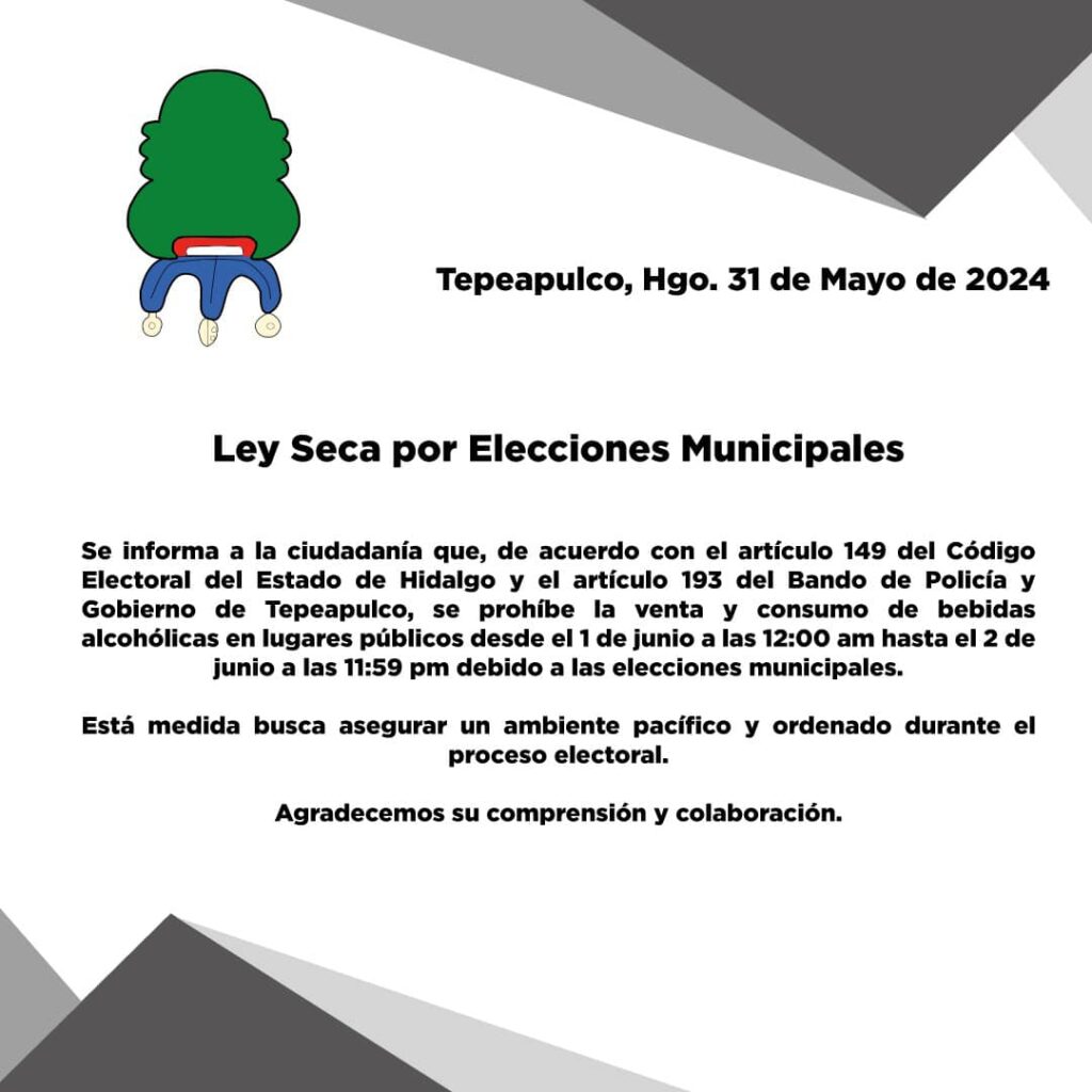 TPEAPULCO, Hgo. – Con motivo de la Jornada Electoral se informa a la ciudadanía que se implementará ley seca en todo el municipio de Tepeapulco.