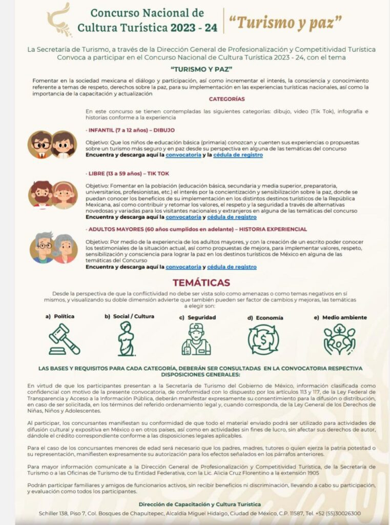 De la misma manera, jóvenes y adultos de entre 13 a 59 años pueden hacerlo con un video (TikTok) en el que se plasme la concientización y sensibilización sobre la paz, para conocer los beneficios de su implementación en los destinos turísticos de México; y también pueden participar adultos mayores (60 años en adelante), para que, a través de una historia experimental por escrito, se pueda conocer los testimoniales de la situación actual.