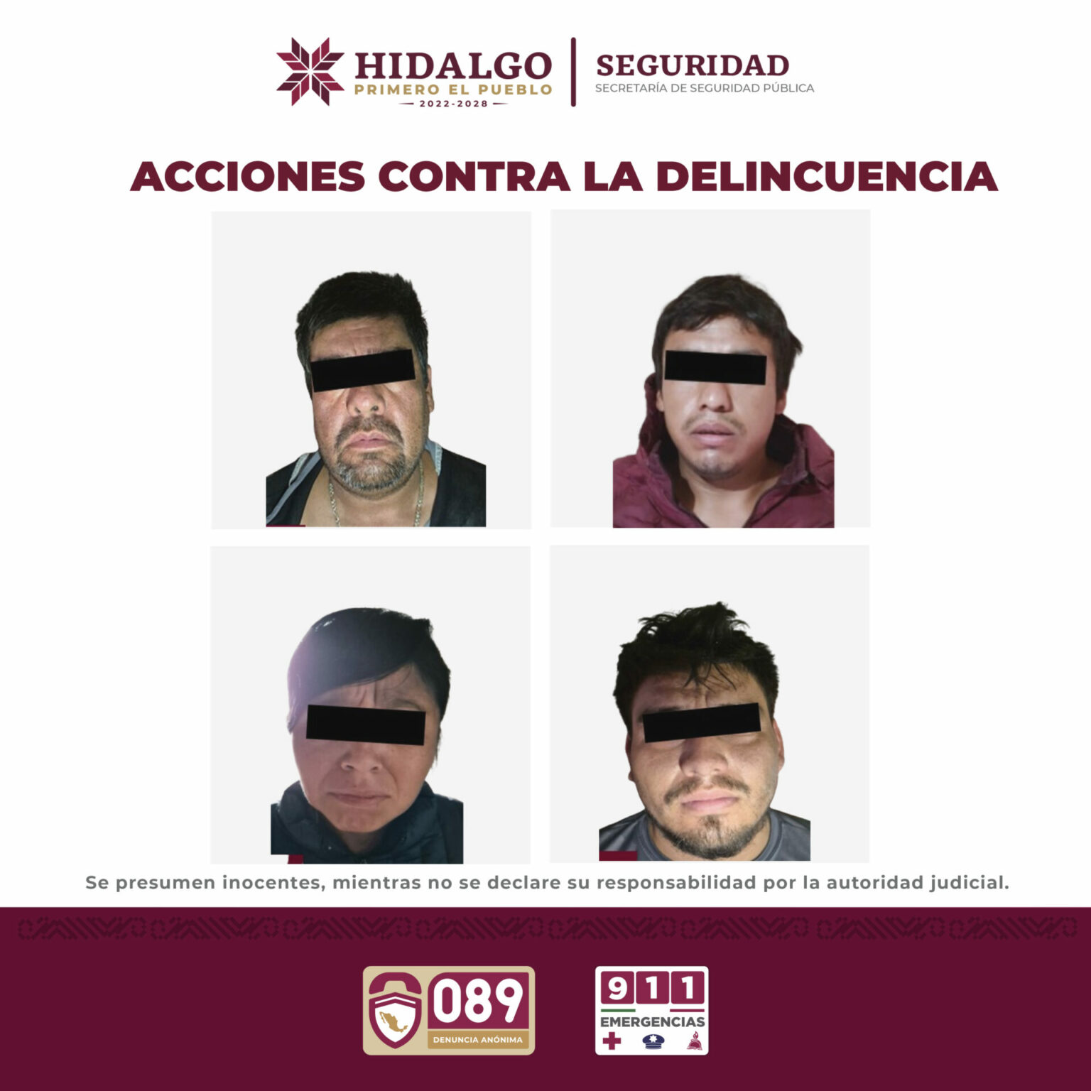 Durante la ejecución de un operativo, elementos adscritos a la Secretaría de Seguridad Pública de Hidalgo (SSPH) detuvieron a cuatro personas presuntamente relacionadas con actividades delictivas en el municipio de Zimapán.