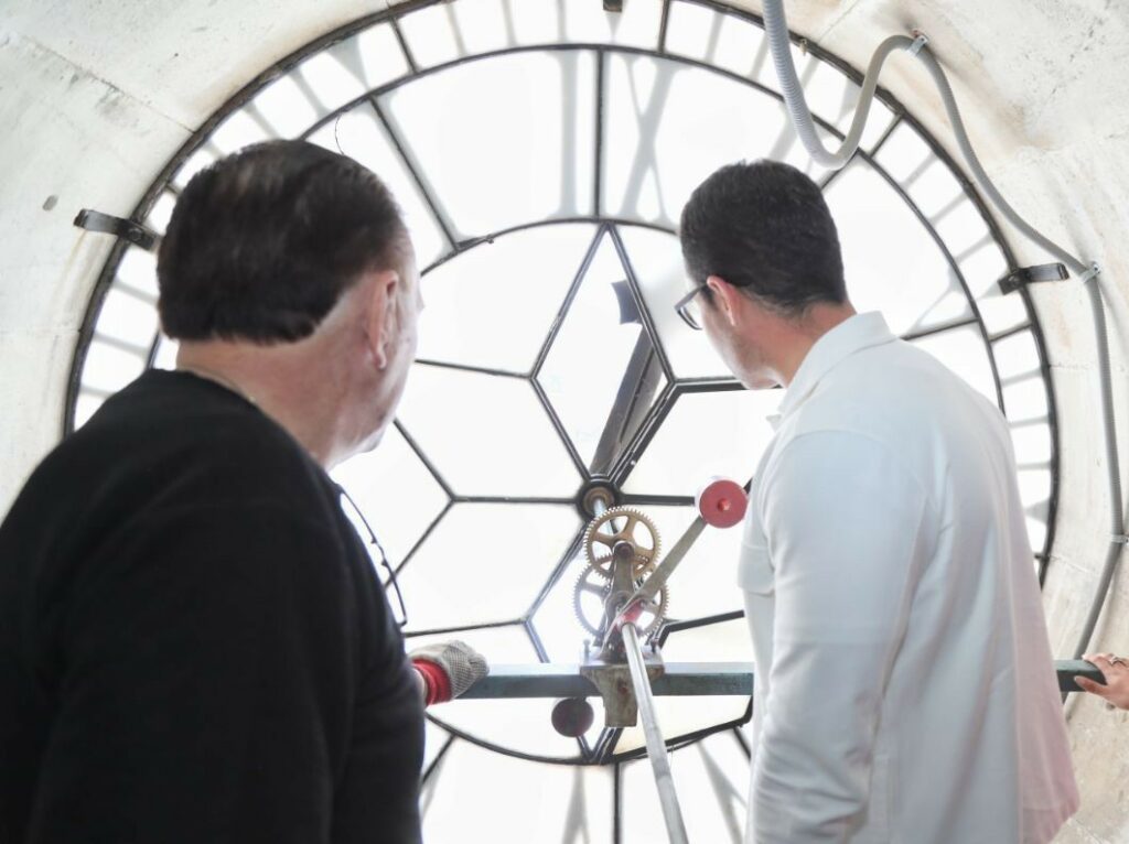 El alcalde recorrió la exposición de la historia del Reloj, además de que subió hasta el campanario, en dónde dio cuerda a la máquina que hace funcionar adecuadamente este monumento.