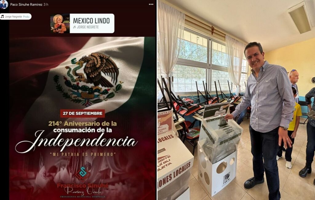 Paco Sinuhé Ramírez, profesor y alcalde de Zempoala, Hidalgo, en su cuenta de Facebook realizó la publicación de un póster donde anuncia el 27 de septiembre, 214 Aniversario de la consumación de la Independencia, “Mi patria es primero”. Al final se lee Francisco Sinuhé Ramírez Oviedo, Presidente Municipal Zempoala.