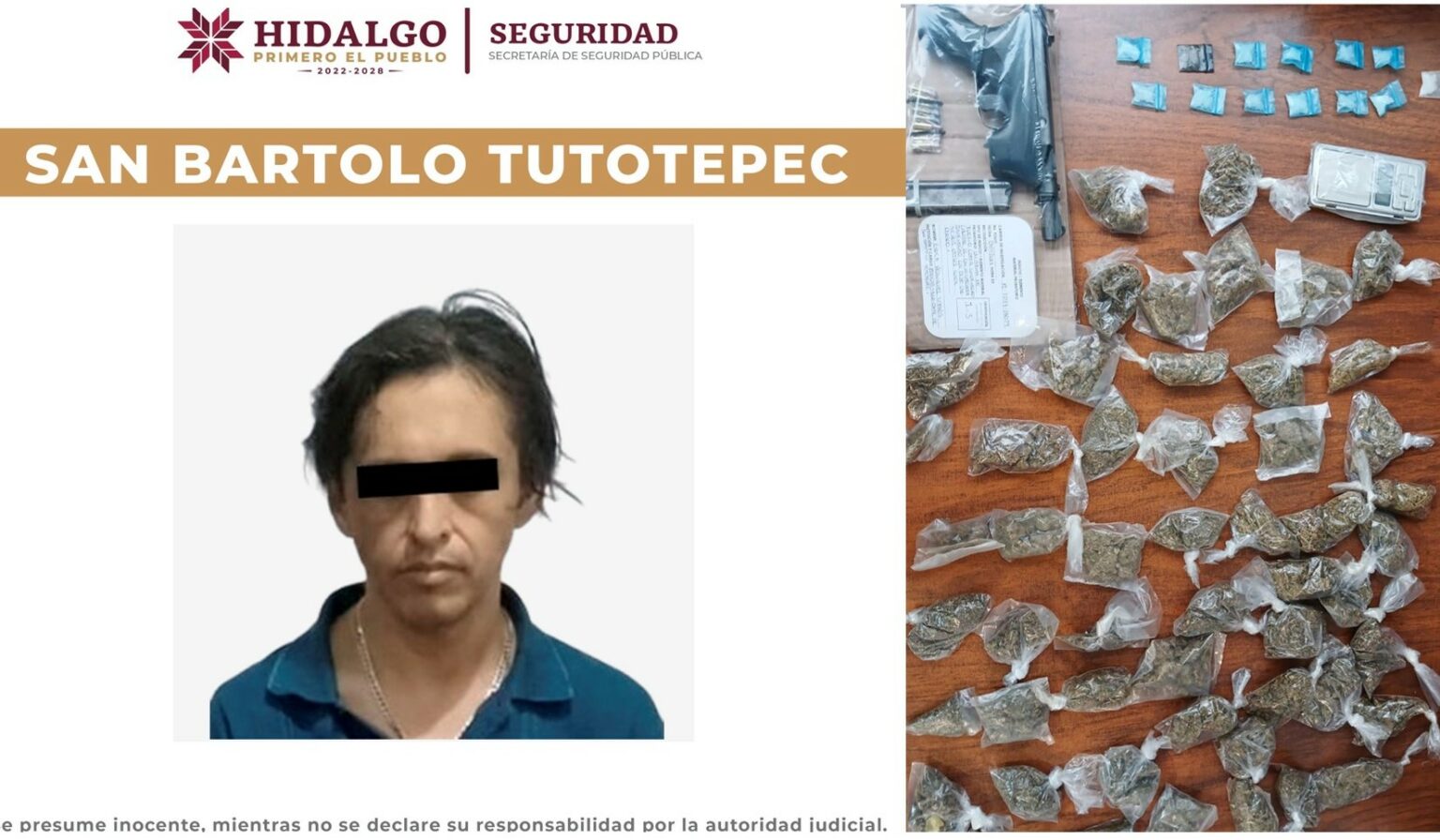 La detención se llevó a cabo en la colonia Los Reyes del municipio de San Bartolo Tutotepec, luego de que los agentes le detectaron diversos envoltorios de presunta droga.