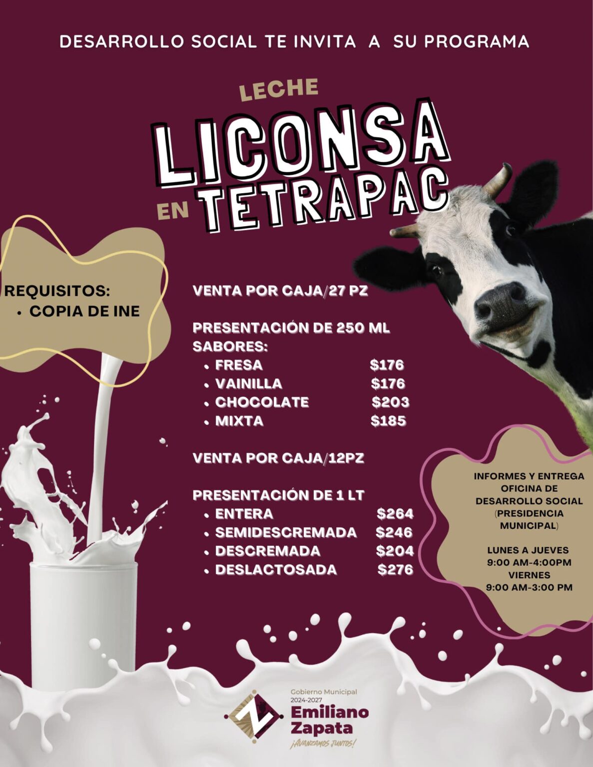 EMILIANO ZAPATA, Hgo. – Presidencia municipal de Emiliano Zapata hace una invitación a los vecinos del municipio para ser beneficiados con el programa «Leche Liconsa en Tetrapac”.