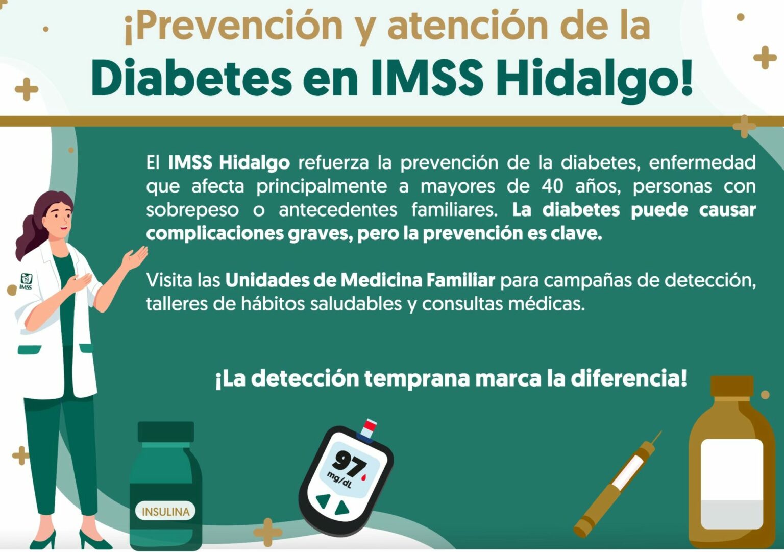 El IMSS en Hidalgo invita a que acudan a las UMF a la detección temprana, ya que puede marcar la diferencia en el tratamiento de la diabetes y, en los Módulos PrevenIMSS se puede recibir orientación sobre cómo adoptar rutinas de vida saludables.