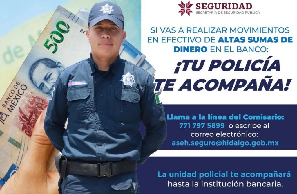 PACHUCA, Hgo. La Secretaría de Seguridad Pública de Hidalgo (SSPH), mediante el programa “Tu policía te acompaña”, ofrece resguardo policial a ciudadanos que requieran protección al momento de realizar movimientos en efectivo de altas sumas de dinero, así como para la compra-venta de vehículos.