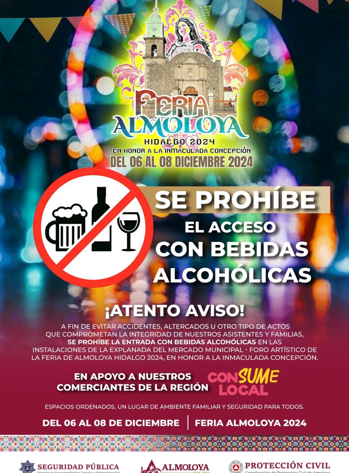 Con la finalidad de garantizar un ambiente familiar y seguro se informa a la población que está prohibido el accesos con bebidas embriagantes al las instalaciones del recinto ferial que se realizara en la zona del mercado.