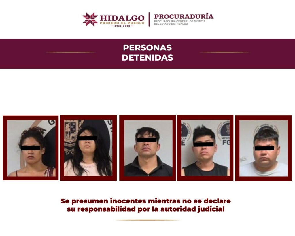 Como resultado de esas acciones se logró la detención de tres personas de sexo masculino identificadas con iniciales D. B. M., B. H.P. y R. B. R., así como dos de sexo femenino de iniciales M. M. R. S. y H. R. E. S., quienes fueron trasladadas a Hidalgo para ser presentadas a un juez de control para que en audiencia inicial se les formule imputación por secuestro agravado.