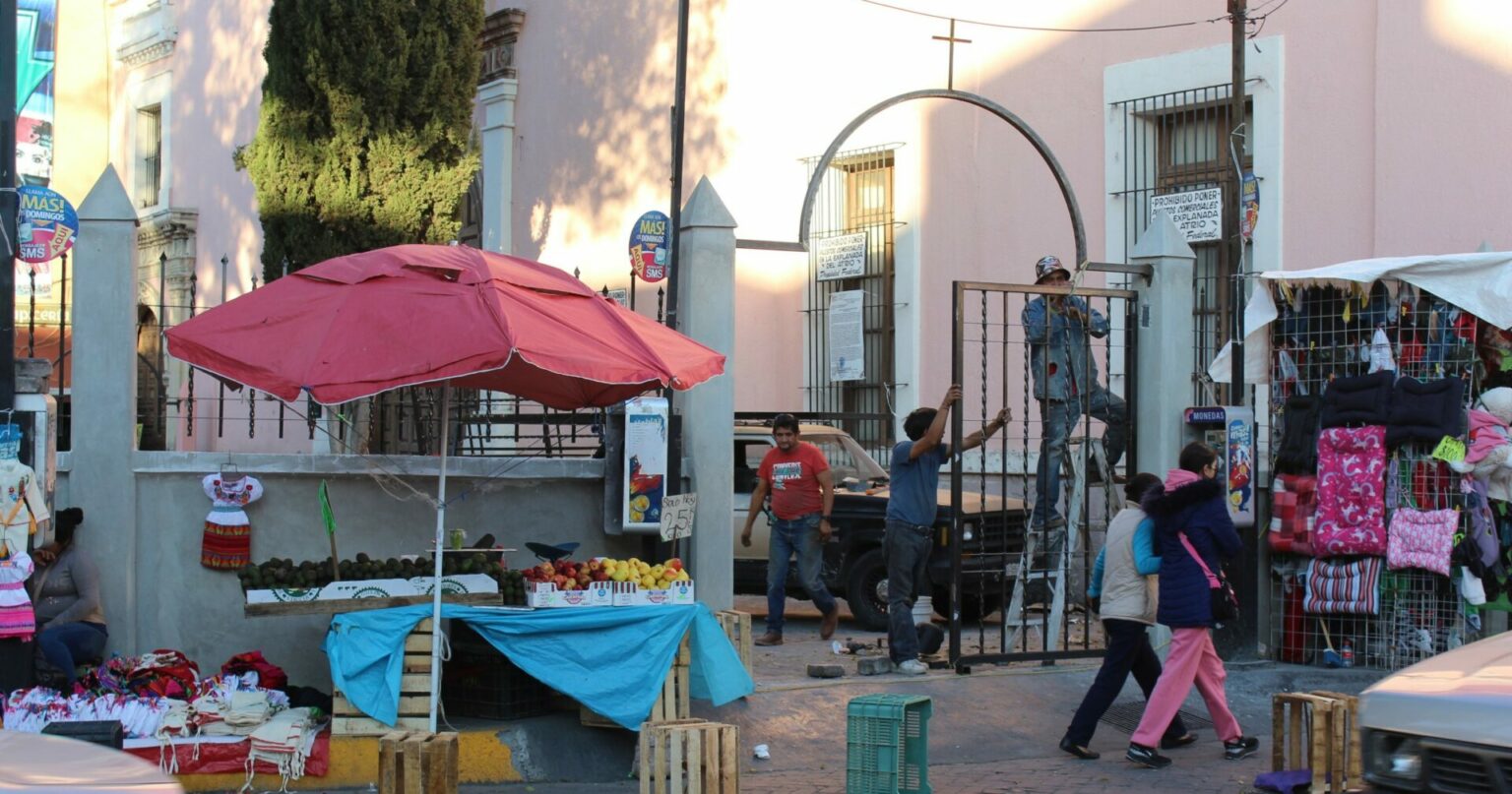 Protección Civil determino que los vendedores ambulantes y sus clientes representan un peligro al estar sobre la acera y arroyo vehicular de Plaza Constitución, especialmente, los que obstruyen el acceso al recinto religioso.