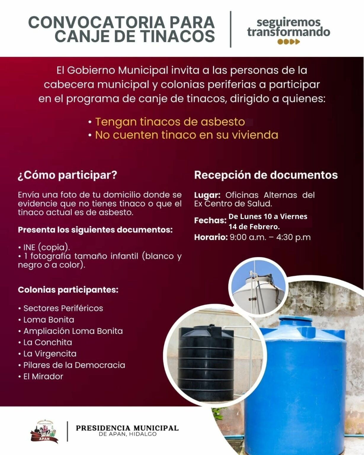 APAN, Hgo. – ¡Aprovecha esta oportunidad! La convocatoria para el canje de tinacos estará abierta unos días más, por lo que podrás acudir del lunes 10 al viernes 14 de febrero a la Oficina de Desarrollo Social en un horario de 9:00 a.m. a 4:30 p.m.