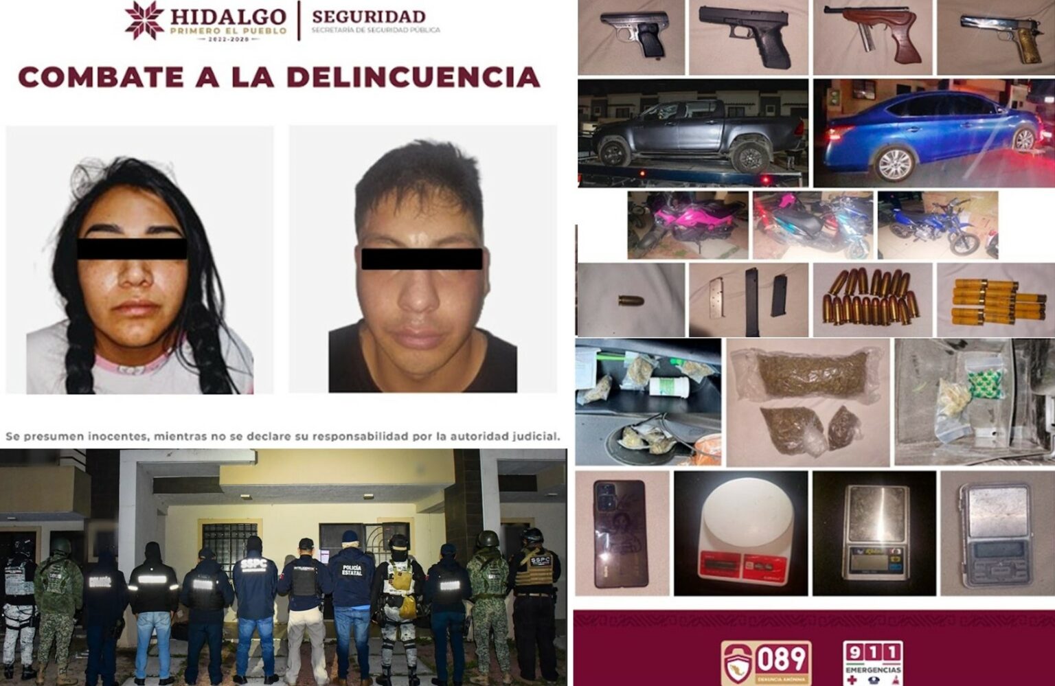 Durante las diligencias fueron asegurados una mujer y un hombre que responden a las siglas C. X. G. C., y F. G. H., ambos originarios de la CDMX, así como cuatro armas cortas cargadas y listas para usarse, 31 cartuchos útiles, tres cargadores abastecidos, mil 500 dosis de presunta marihuana y 833 dosis de sustancia granulada con características propias de la cocaína, un celular y cuatro motocicletas sin placas.
