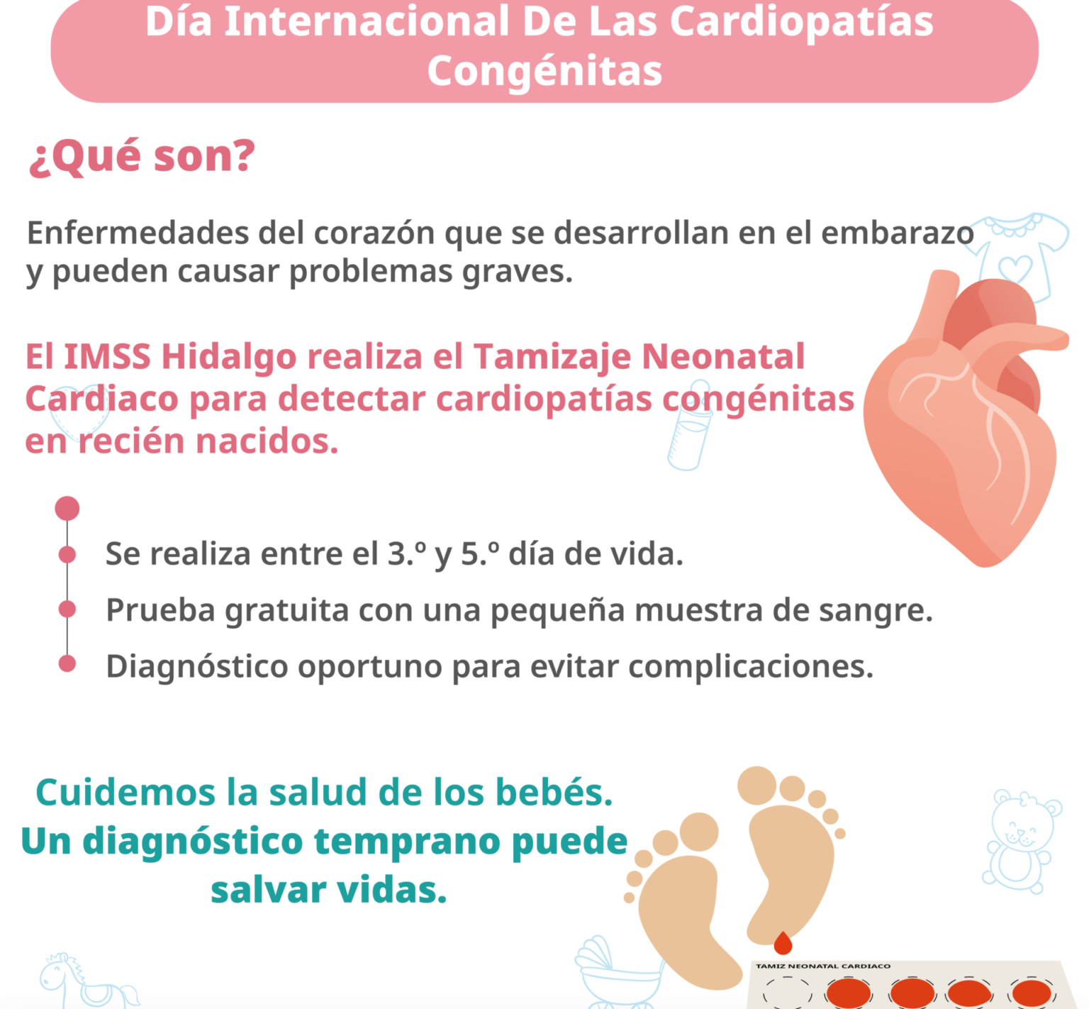 PACHUCA, Hgo. – En el marco del Día Internacional de las Cardiopatías Congénitas, el Instituto Mexicano del Seguro Social (IMSS) en Hidalgo sensibiliza a la población para que conozca acerca de estas enfermedades que afectan a los bebés, las cuales se desarrollan principalmente durante el proceso de gestación y se caracterizan por alterar la estructura y función del corazón.