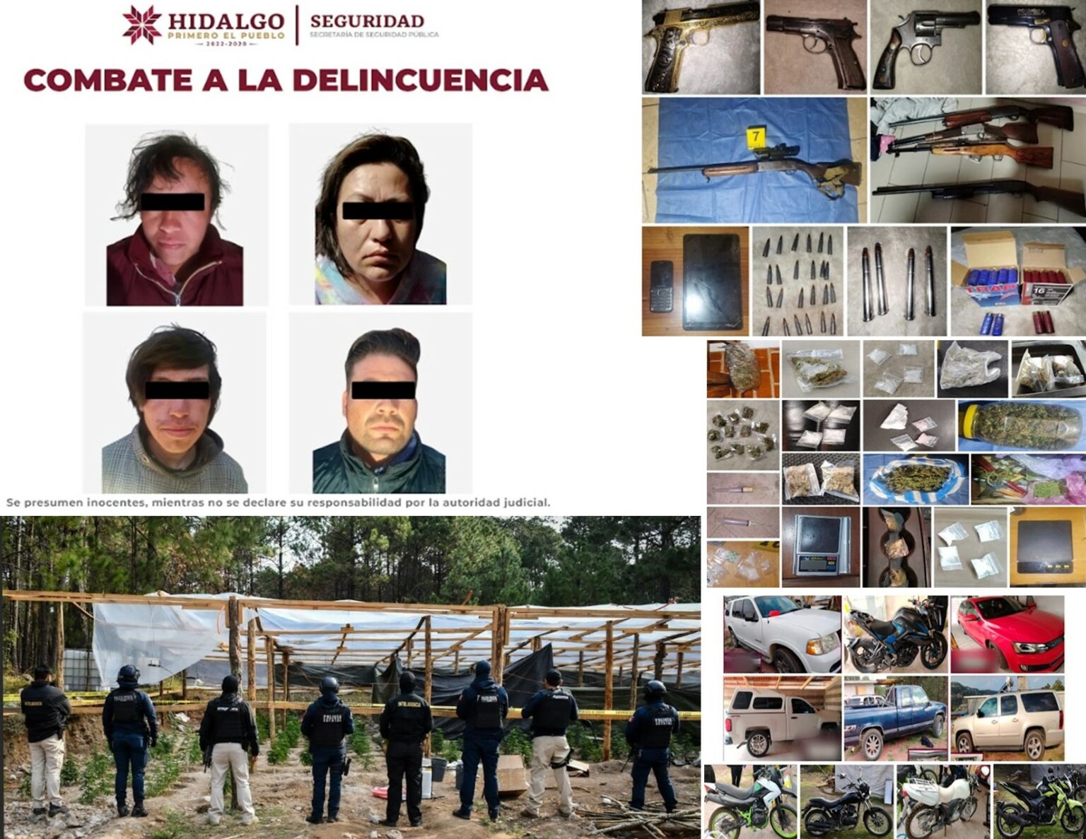 Las personas aseguradas, vehículos, plantas de marihuana y sus derivados, así como objetos varios, fueron puestos a disposición de la autoridad competente mientras continúan las investigaciones.