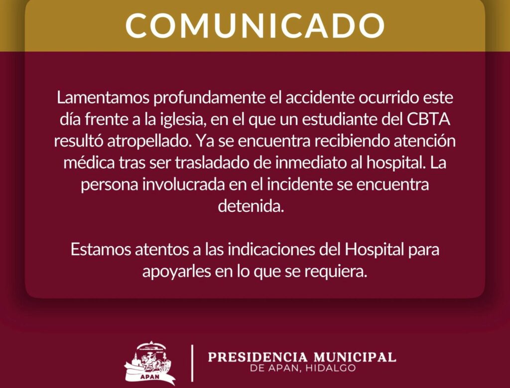APAN, Hgo. – Lamentamos profundamente el accidente ocurrido este día frente a la iglesia, en el que un estudiante del CBTA resultó atropellado. Ya se encuentra recibiendo atención médica tras ser trasladado de inmediato al hospital. La persona involucrada en el incidente se encuentra detenida.