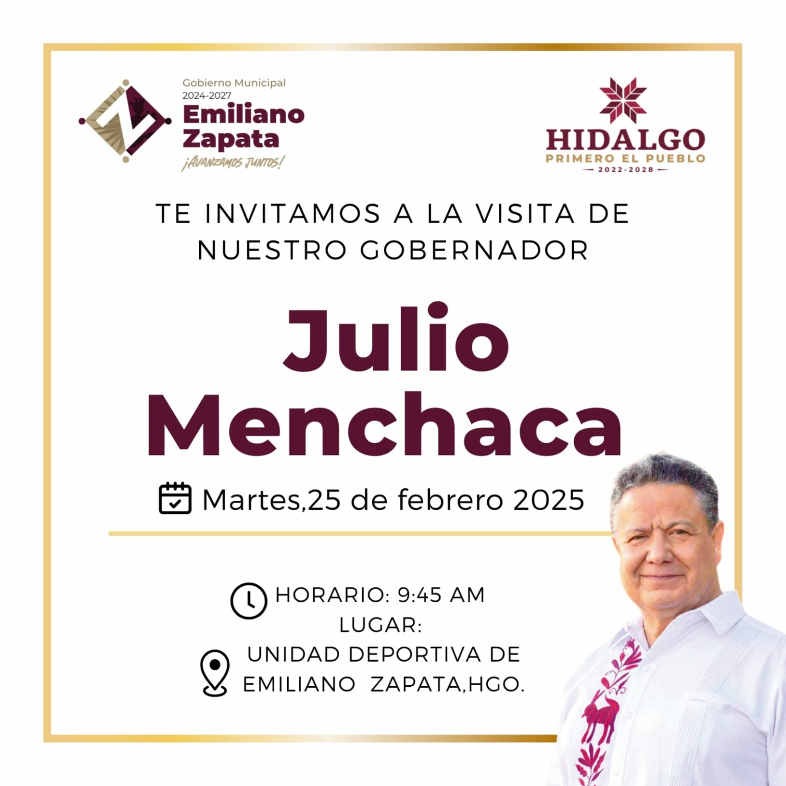 EMILIANO ZAPATA, Hgo. – El gobernador Julio Menchaca Salazar y las Rutas de la Transformación llegan mañana martes 25 de febrero a Emiliano Zapata, estarán en la unidad deportiva de la ciudad.
