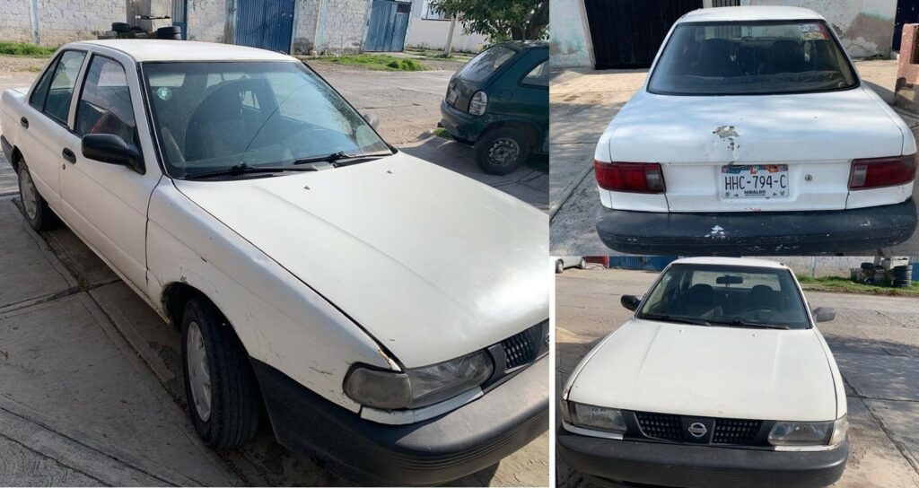 Dejaron estacionado el Nissan Tsuru, color blanco, mismo que tiene el número de placa HHC794C, pero precisaron que le falta la matricula delantera.