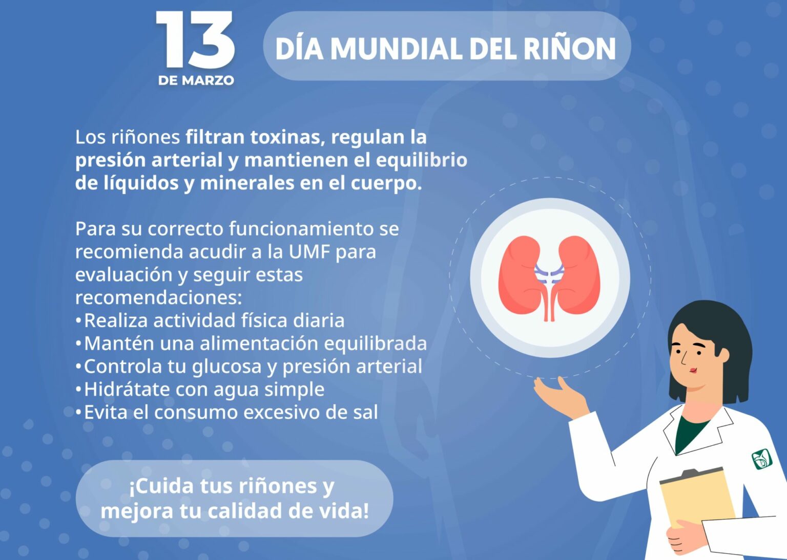 El Instituto Mexicano del Seguro Social (IMSS) en Hidalgo conmemora el Día Mundial del Riñón cada segundo jueves de marzo, promoviendo entre los derechohabientes la importancia de la educación sanitaria y la atención a la salud integral para prevenir de la Enfermedad Renal Crónica (ERC) que podría ocasionar complicaciones graves si no se detecta a tiempo.