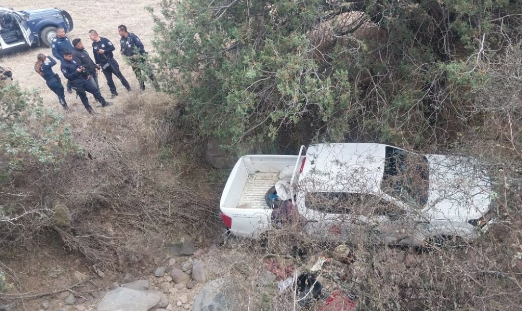 A la altura de la localidad de Los Cides fue encontrada desbarrancada la camioneta de PEMEX, inclusive, se dice que ya localizaron a dos empleados, pero faltan otros dos y los buscan hasta por debajo de las piedras.
