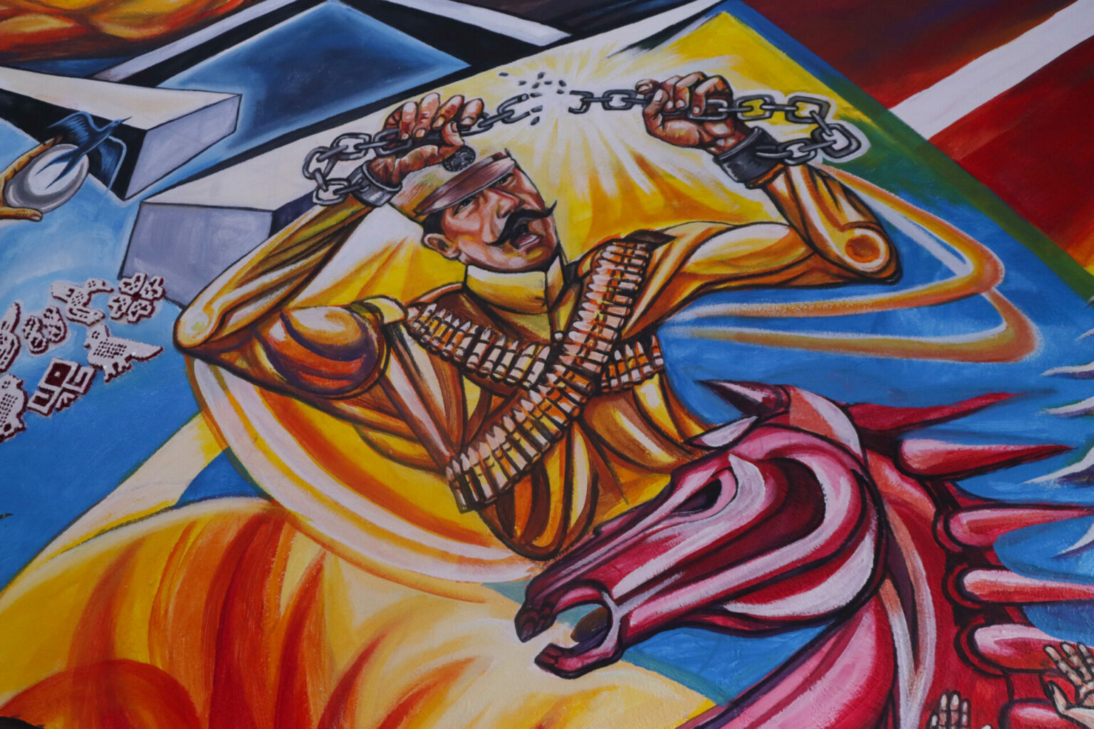 Jesús Rodríguez Arévalo presentó su mural titulado ‘Apoteosis de la transformación’, una obra que rinde homenaje a la madre tierra y hace alusión a las culturas originarias. En la representación, la figura central sostiene en una mano un corazón que simboliza el pasado, mientras que con la otra toca un astro de luz que representa el conocimiento y el futuro hacia el cual se dirige el presente.