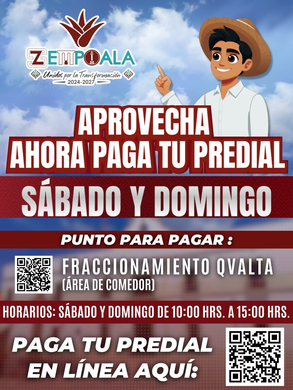 Zempoala, Hgo. – La presidencia municipal invita a la población en general a cumplir con el pago de predial, inclusive, ahora en el área de comedor del fraccionamiento “Qvalta” de manera permanente se puede cumplir con la obligación en horario de 10:00 a 15:00 horas.