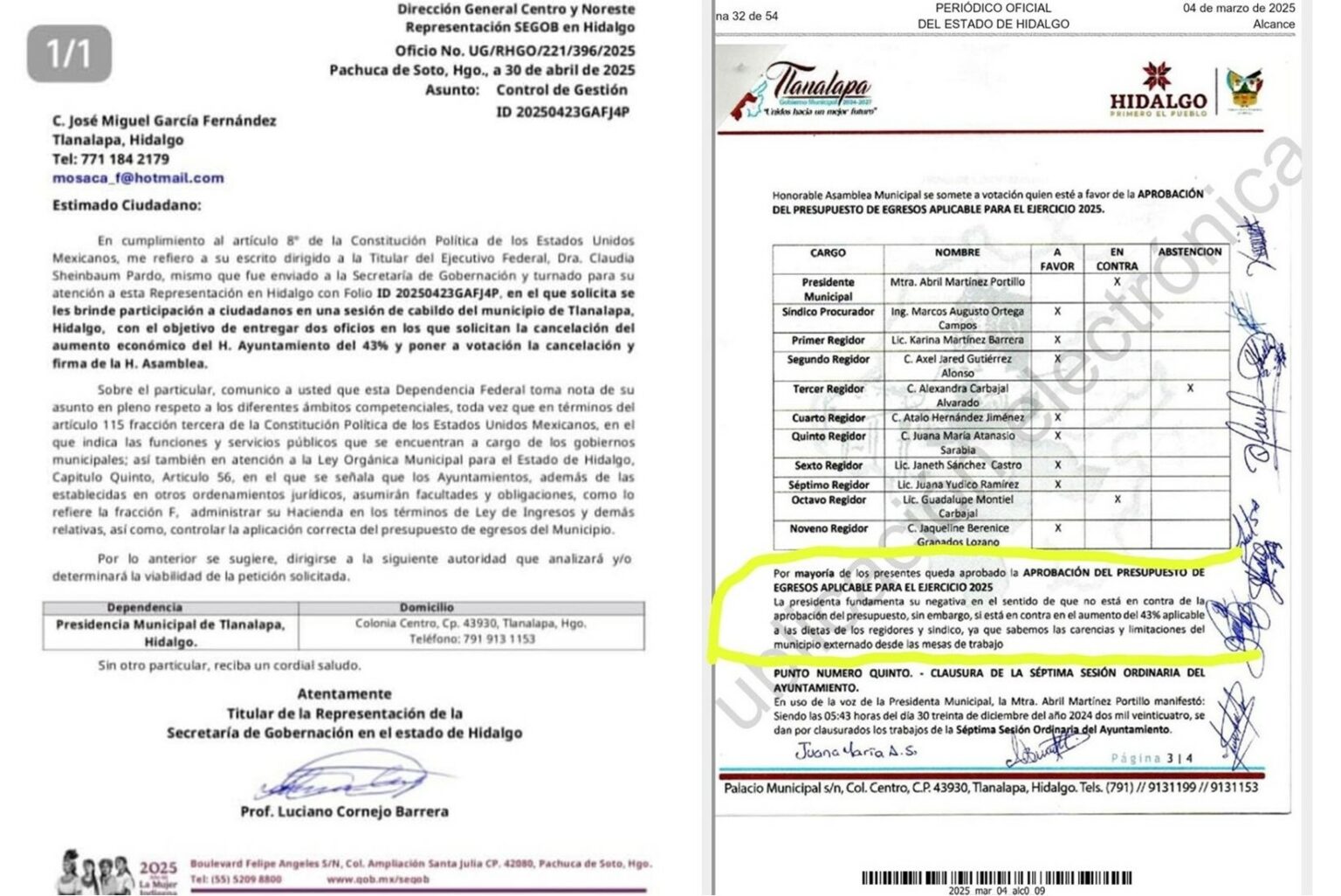 La alcaldesa Abril Martínez Portillo asentó en el acta de cabildo que estaba de acuerdo en la aprobación del presupuesto de egresos 2025, sin embargo, no está de acuerdo en el aumento del 43 por ciento a las dietas de regidores y sindico.