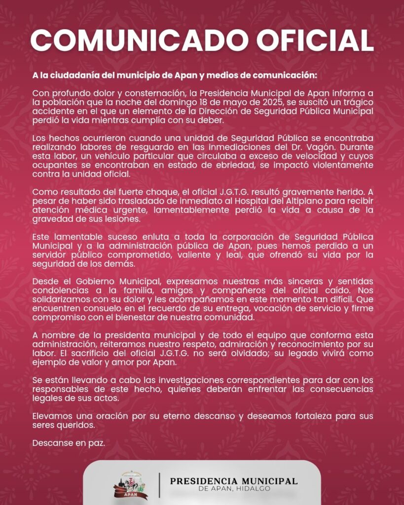 Con profundo dolor, la Presidencia Municipal de Apan informó del fallecimiento del oficial J.G.T.G., elemento de la Dirección de Seguridad Pública Municipal, quien perdió la vida la noche del domingo 18 de mayo de 2025 mientras realizaba labores de resguardo en las inmediaciones del Dr. Vagón.