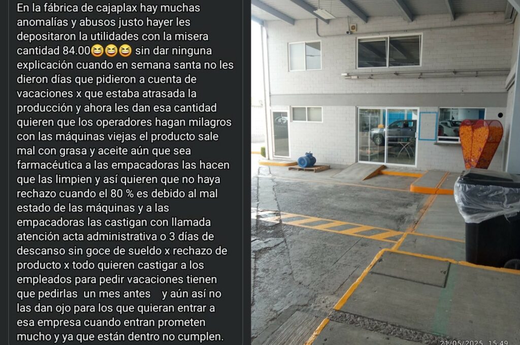 APAN, Hgo. – Cientos de trabajadores que prestan sus servicios en la empresa Cajaplax solicitan la intervención de las autoridades laborales para recibir una justa participación en las utilidades de la empresa, pues les 84 pesos.