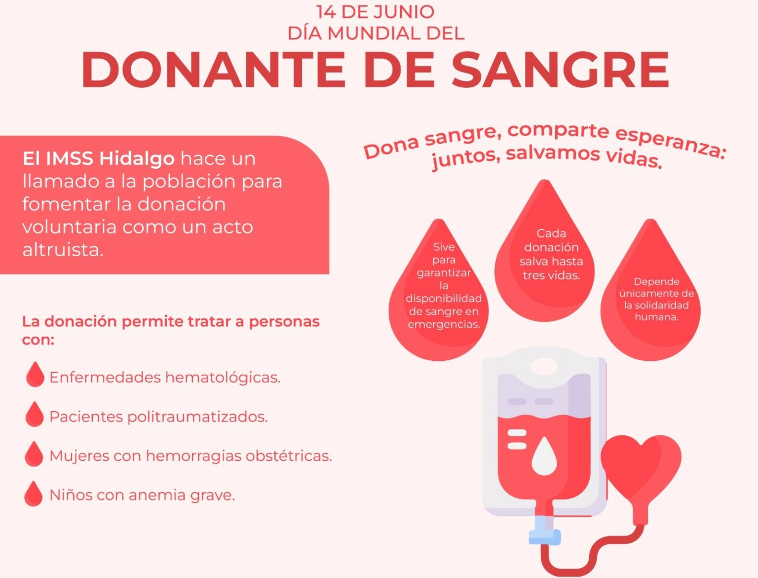 En el marco del Día Mundial del Donante de Sangre, que se conmemora el 14 de junio, el Instituto Mexicano del Seguro Social (IMSS) en Hidalgo hace un llamado a la población para fomentar esta acción voluntaria y solidaria, esencial para salvar vidas y garantizar disponibilidad en emergencias, cirugías, tratamientos oncológicos y atención obstétrica.