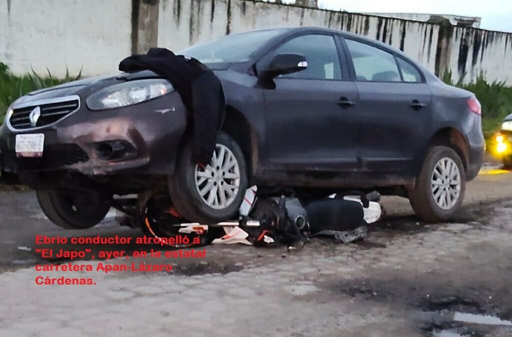 Vecinos informan que un sujeto en estado de ebriedad, el día de ayer, conducía su automóvil en la carretera Apan-Lázaro Cárdenas, a la altura de la ex hacienda de San Juan Ixtilmaco, atropelló a joven motociclista identificado como “El Japo”.