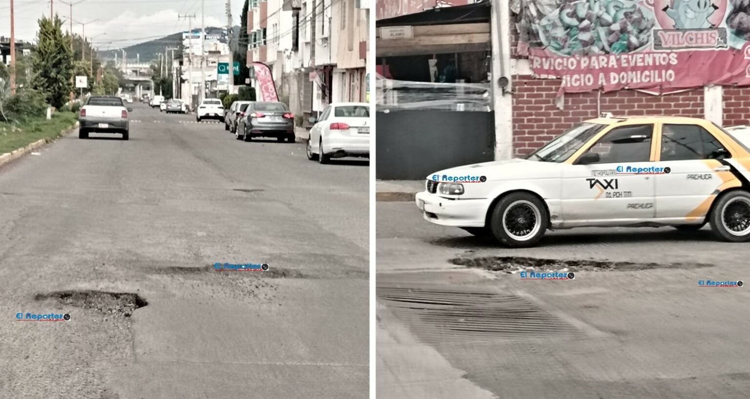 La tarde de ayer, salimos de la vía Pachuca-Tulancingo e iniciamos un recorrido por la avenida Paseos de El Álamo, vialidad de cuatro carriles que en ambos sentidos esta deplorable.