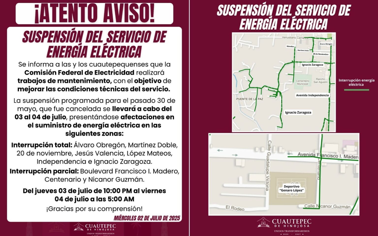 CUAUTEPEC DE HINOJOSA, Hgo. – JA través de la Comisión Federal de Electricidad nos hacen llegar la siguiente información: