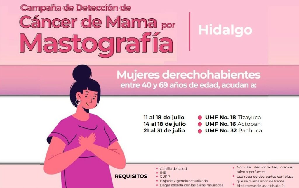 PACHUCA, Hgo. – El Instituto Mexicano del Seguro Social (IMSS) en Hidalgo invita a las mujeres derechohabientes de 40 a 69 años a participar en las Jornadas de Mastografías que se llevarán a cabo en julio en diversas Unidades de Medicina Familiar (UMF).