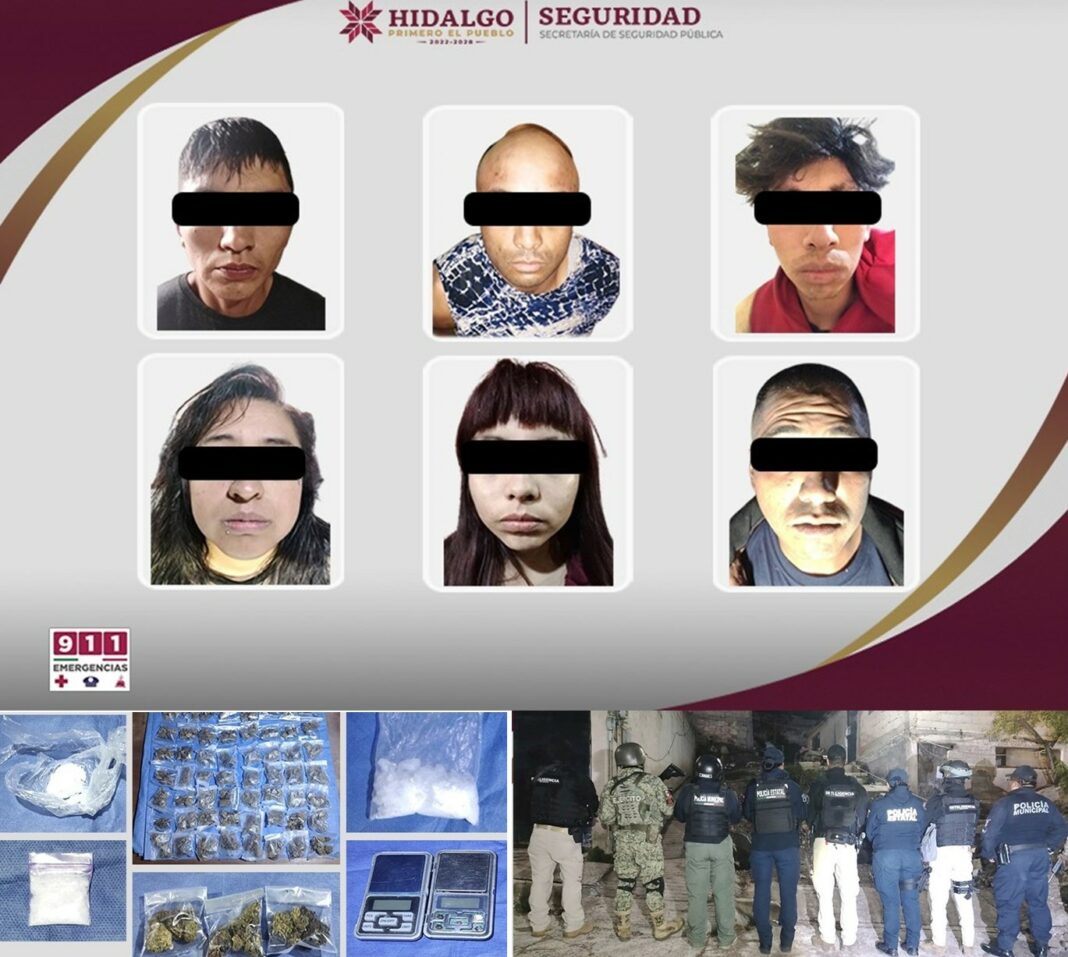 Derivado de ello, y en coordinación interinstitucional con la Procuraduría General de Justicia de Hidalgo (PGJEH), Sedena y Policía de Pachuca, fueron detenidos cuatro hombres de iniciales D. A. F. O., L. F. R. G., A. M. T. y M. R. G., así como dos mujeres de nombre V. V. R. V. y A. S. A.