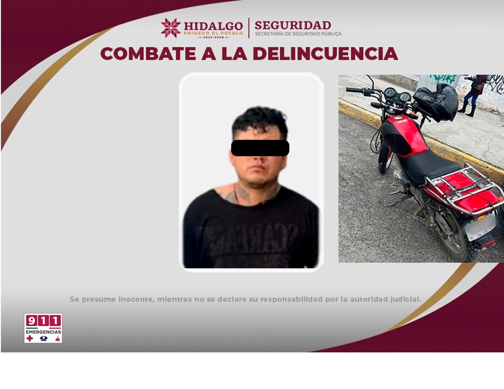 Tras el análisis videográfico, se identificó al sospechoso, quien se desplazaba a bordo de una motocicleta marca Honda, color negro con rojo, misma que fue ubicada momentos después, cuando circulaba sobre la carretera Pachuca – Tulancingo, a la altura de la colonia 11 de Julio.