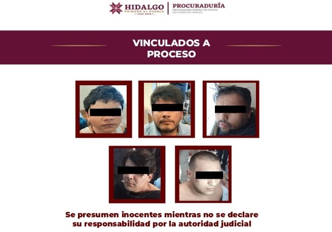 La Procuraduría General de Justicia del Estado de Hidalgo (PGJEH), a través de la Unidad Especializada en Investigación de Homicidio Doloso y Narcomenudeo, obtuvo de la autoridad judicial el auto de vinculación a proceso para cinco personas detenidas durante un cateo.