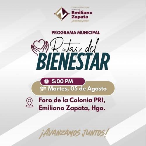 EMILIANO ZAPATA, Hgo. – Te invitamos a participar en las Rutas del Bienestar, una iniciativa en la que todos los servicios de Presidencia Municipal estarán presentes en tu comunidad para brindarte atención ciudadana directa.