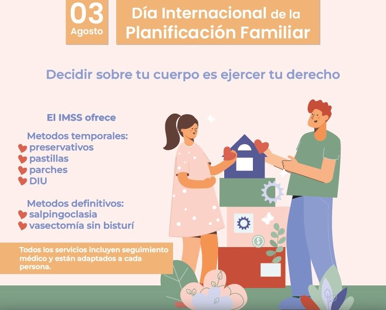 En el l Día Internacional de la Planificación Familiar, 3 de agosto, el Instituto Mexicano del Seguro Social (IMSS) en Hidalgo brinda orientación, servicios y métodos anticonceptivos a mujeres y hombres derechohabientes y no derechohabientes, con el objetivo de que puedan tomar decisiones informadas y responsables sobre su salud sexual y reproductiva.