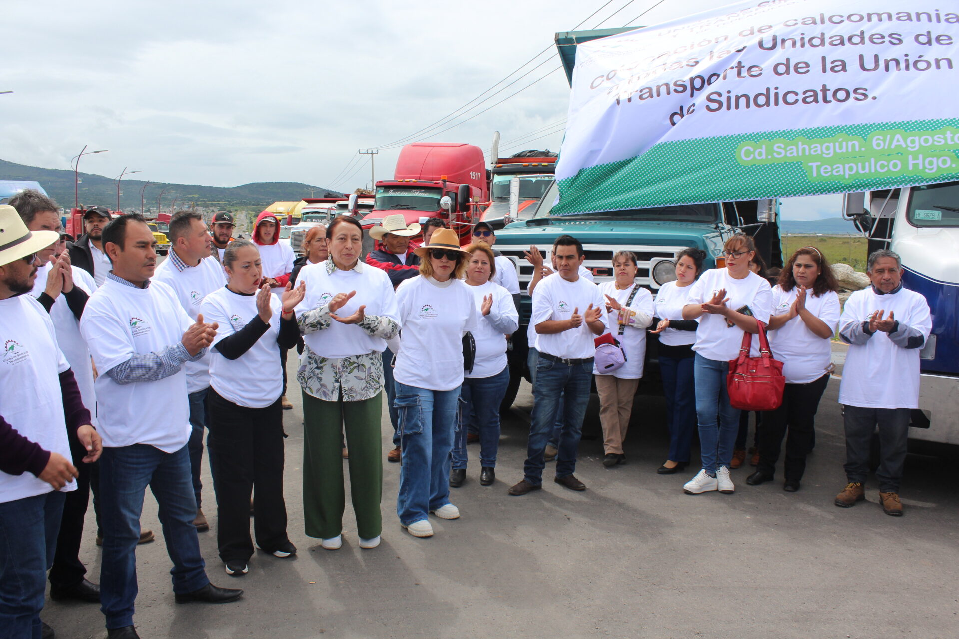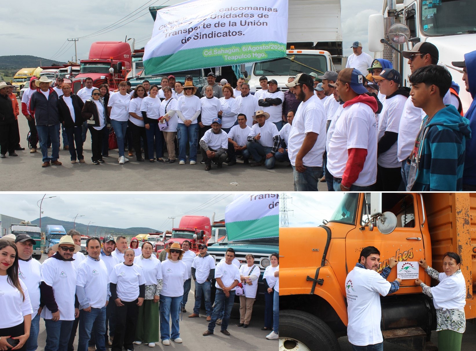 Poco más de cien vehículos pesados entre volteos, pipas, torton. tráileres y maquinaria, aproximadamente a las 09:00 horas de hoy, se parquearon en el tramo recién reconstruido del bulevar de Ciudad Sahagún, así inicio la colocación de calcomanías con logotipo de la naciente organización sindical.