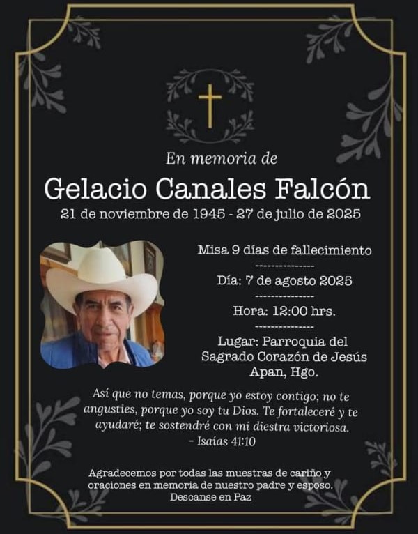 APAN, Hgo. – Al medio día de hoy, se llevará a cabo la misa de los nueve días del fallecimiento del amigo de todos Gelacio Canales Falcón.