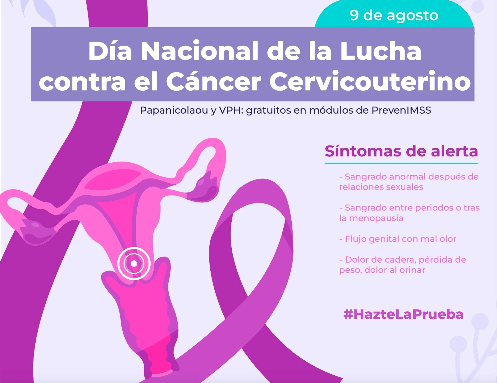 En el marco del Día Nacional de la Lucha contra el Cáncer Cervicouterino, 9 de agosto, el Instituto Mexicano del Seguro Social (IMSS) en Hidalgo refuerza su compromiso con la lucha contra esta enfermedad, y hace un llamado urgente a la población derechohabiente a realizar de manera periódica exámenes como el Papanicolaou y la prueba del Virus del Papiloma Humano (VPH), los cuales gratuitos dentro de los Módulos de PrevenIMSS.