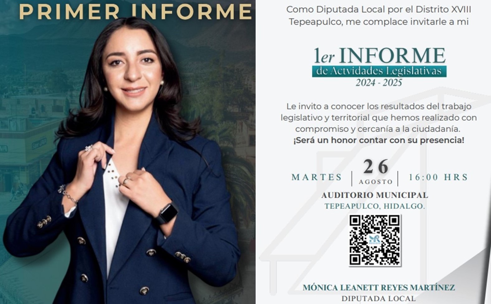TEPEAPULCO, Hgo. – Mónica Leanett Reyes Martínez, diputada local por el Distrito XVIII Tepeapulco, a las 16:00 horas del próximo 26 de agosto, rendirá su primer informe como legisladora representante de los municipios de Almoloya, Apan, Cuautepec de Hinojosa, Emiliano Zapata y Tepeapulco.