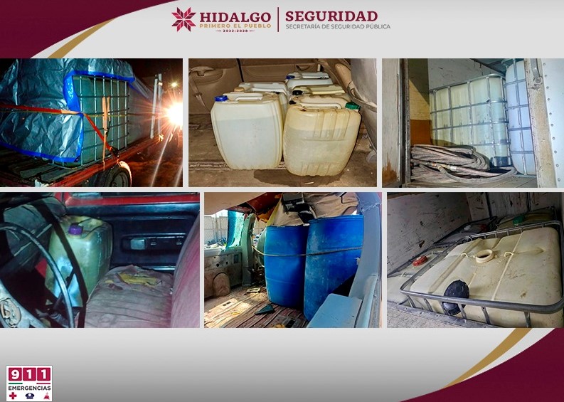 En operaciones de prevención y combate al delito, agentes de la Secretaría de Seguridad Pública de Hidalgo (SSPH) llevaron a cabo la recuperación de 4 mil 145 litros de combustible, 200 metros de manguera de alta presión y el aseguramiento de cuatro vehículos.