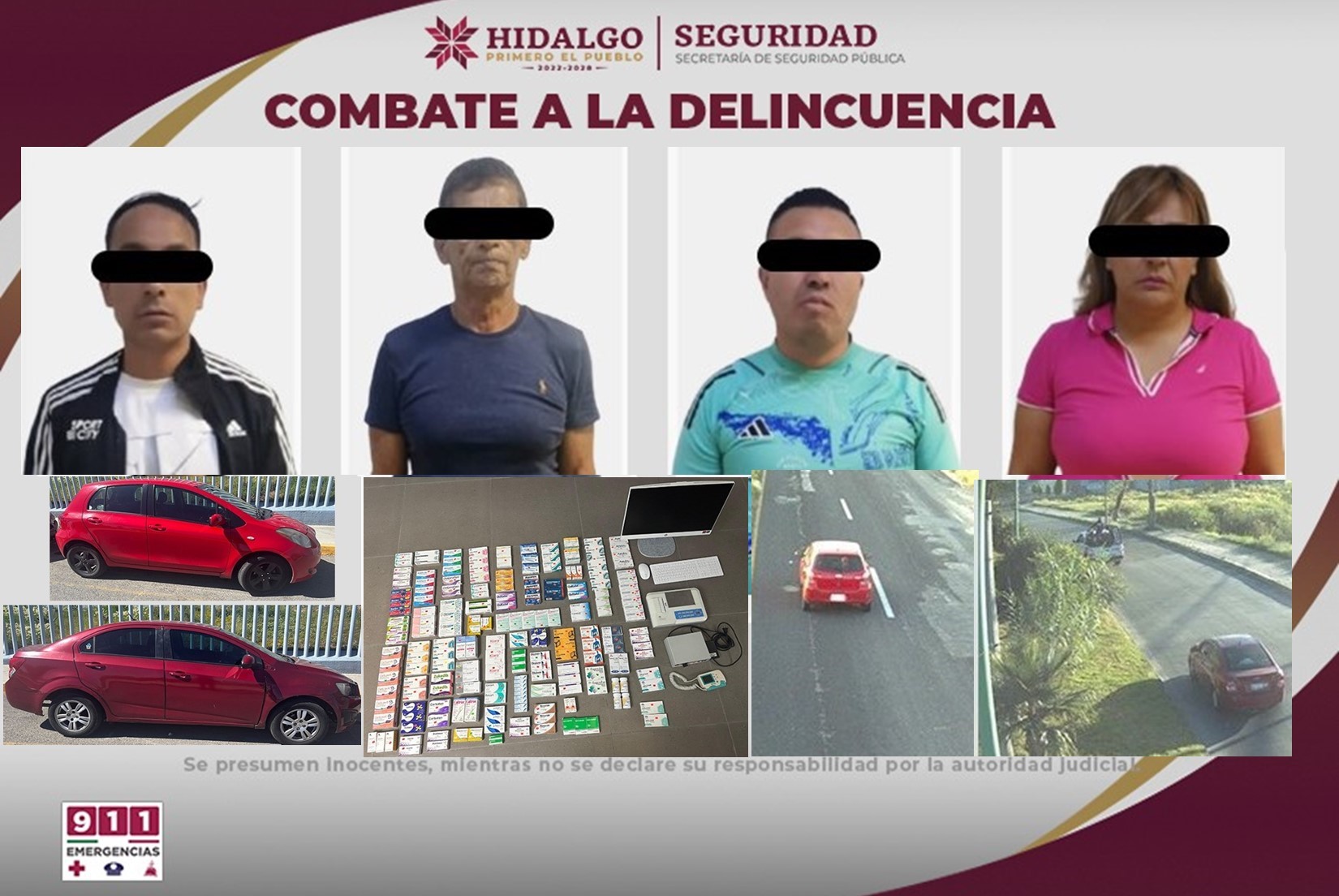 PACHUCA, Hgo. – En seguimiento a labores de investigación e inteligencia operativa, agentes de la Secretaría de Seguridad Pública de Hidalgo (SSPH) lograron la captura de tres hombres y una mujer, quienes, se presume, están relacionados con los robos cometidos en dos consultorios médicos de Pachuca y Actopan.