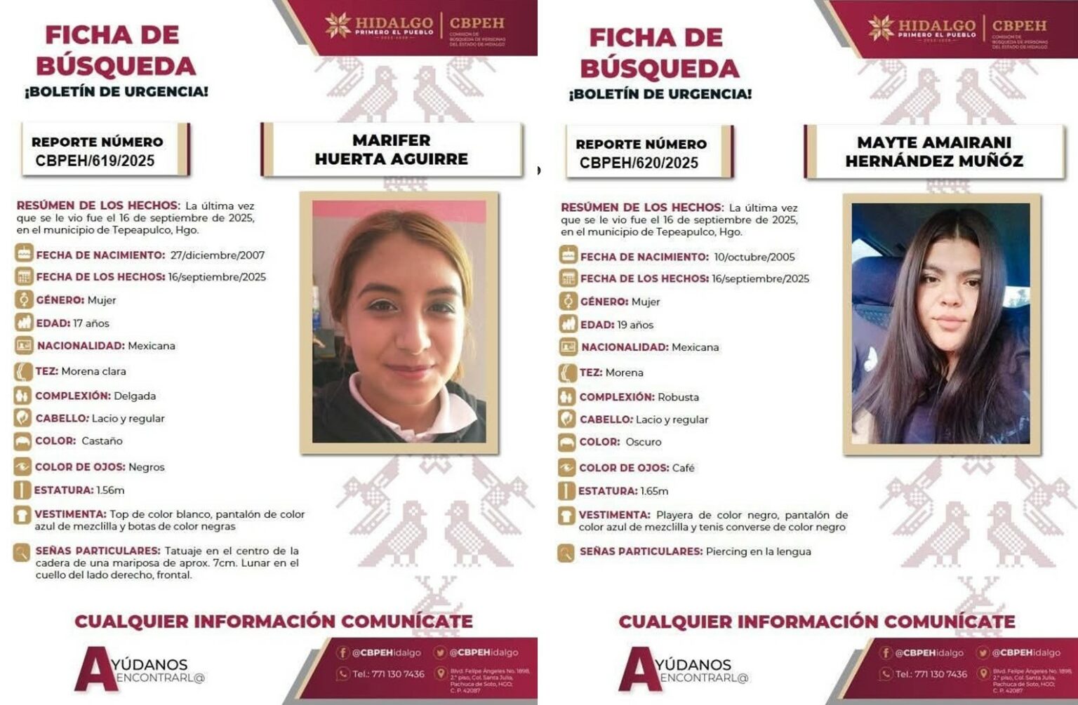 TEPEAPULCO, Hgo. – Familiares y amigos solicitan apoyo de la población en general para compartir la publicación y localizar ponto a dos jovencitas desaparecidas el 16 de septiembre en Tepeapulco.