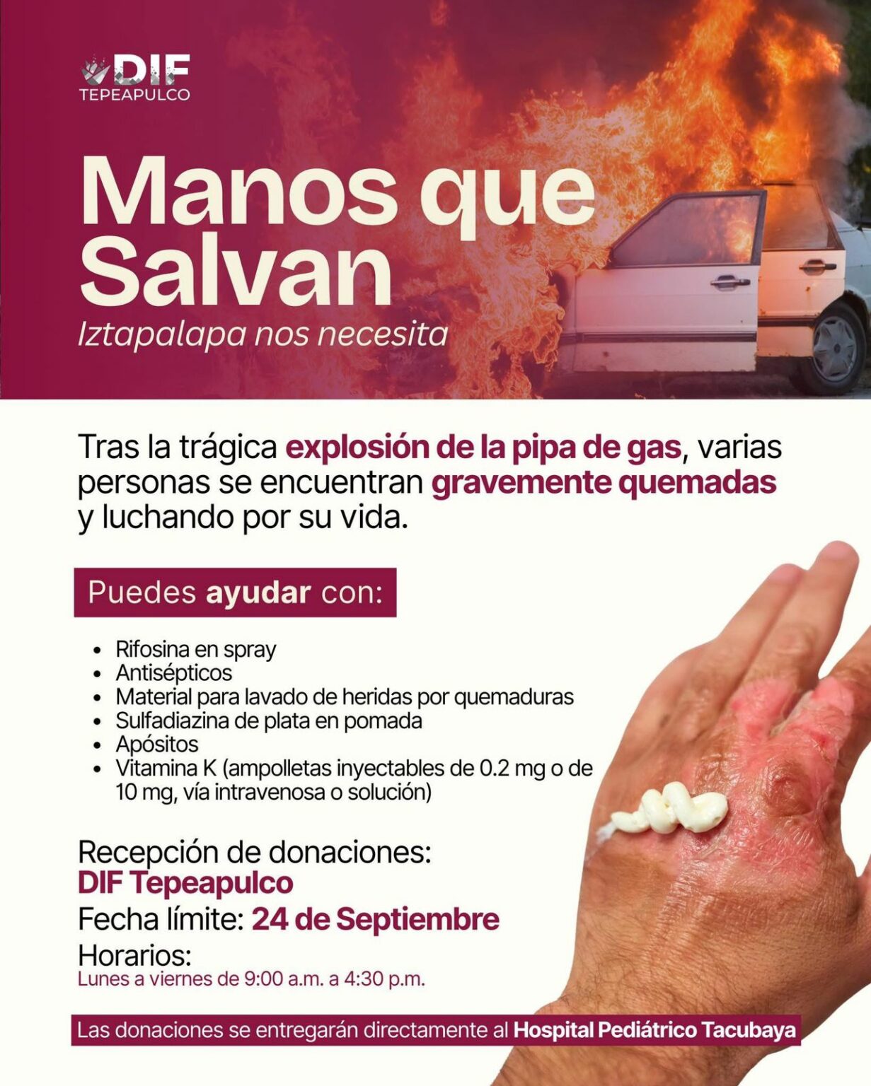 TEPEAPULCO, Hgo. – El DIF Municipal de Tepeapulco hace una invitación para sumarse a la acción “Manos que Salvan” en apoyo a las víctimas de la explosión de pipa que transportaba gas en la Ciudad de México.