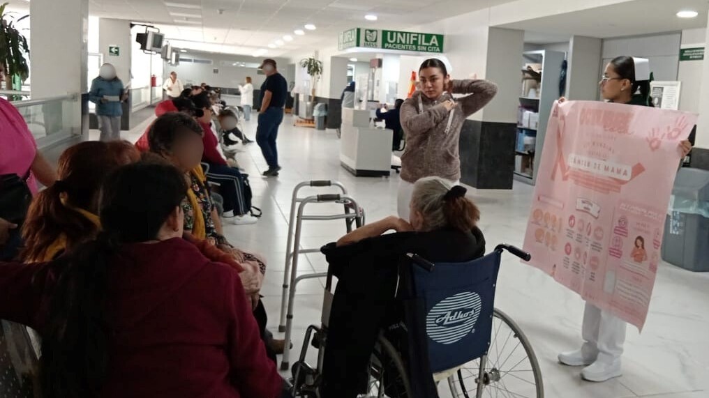 Las actividades se realizaron en la Unidad de Medicina Familiar (UMF) No. 34, donde personal de Enfermería brindó información sobre autoexploración mamaria, factores de riesgo y la importancia de acudir a revisión médica periódica, pues la detección temprana puede salvar vidas.